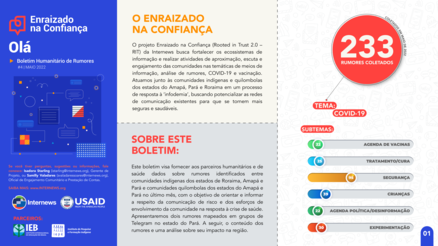 "Este boletim visa fornecer aos parceiros humanitários e de saúde dados sobre rumores identificados entre comunidades indígenas dos estados de Roraima, Amapá e Pará e comunidades quilombolas dos estados do Amapá e Pará no último mês, com o objetivo de orientar e informar a respeito da comunicação de risco e dos esforços de envolvimento da comunidade na resposta à crise de saúde. Apresentaremos dois rumores mapeados em grupos de Telegram no estado do Pará. A seguir, o conteúdo dos rumores e uma análise sobre seu impacto na região." (Página 1)