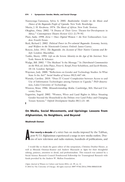 "From Tehran to Tahrir Square to Gezi Park-to mention only three key sites of protest made prominent in 2013-social media has been lauded as one of the key factors enabling popular uprisings and social movements. This has provided further hype for new or digital media, which were already being touted as a tool for social change, liberation, and the representation of marginalized or oppressed voices. In this essay, I argue not against new media per se but against technological determinism and fetishism. I argue that the transformative or repressive potential of different media changes dramatically across different sites of research and depends on the sociopolitical realities of the region being studied, including factors such as censorship, access, and infrastructure. Drawing on my research in Afghanistan, Iran, and Tajikistan, among other neighboring countries, I show the striking differences in the degree of effectiveness and ineffectiveness of different media in bringing about social change in those respective countries as well as regionally. Comparatively speaking, I focus on television and social media's catalytic role in stirring popular uprisings and the subsequent backlash and attack on those media. I also examine the gendered dimensions and dangers of media use and activism. In the case of Afghanistan, I consider the impact of international and transnational funding of media and human rights efforts. I conclude that in order for international interventions into local social movements to succeed, international experts in development, human rights, and media must take the lead from local residents and contexts, technologically and culturally, and work collaboratively with them." (Abstract)