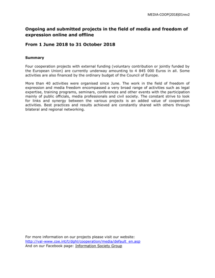 Ongoing and Submitted Projects in the Field of Media and Freedom of Expression Online and Offline. From 1 June 2018 to 31 October 2018