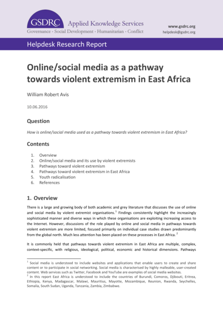 "Key findings include: The Internet can play a role in the radicalisation process; There are few examples of individuals radicalising entirely online, but there are signs that this could increase over time; There is less evidence of the internet’s role in recruitment to terrorist networks or the use of violence – offline socialisation remains of pivotal importance; Groups such as Al Qaeda, Islamic State (IS) and Al-Shabaab have sophisticated online presences, comprising of online media organisations, mother sites feeding content to others, and a large number of other websites and forums maintained by the wider network; Extremists are making more use of social media, and its importance is likely to grow. It is especially important in allowing women to play a larger role in networks; Extremists use the internet for operational purposes, including communication and the coordination of attacks." (Overview, page 2)
