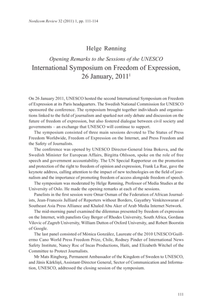 "On 26 January 2011, UNESCO hosted the second International Symposium on Freedom of Expression at its Paris headquarters. The Swedish National Commission for UNESCO sponsored the conference. The symposium brought together individuals and organisations linked to the field of journalism and sparked not only debate and discussion on the future of freedom of expression, but also fostered dialogue between civil society and governments – an exchange that UNESCO will continue to support. The symposium consisted of three main sessions devoted to The Status of Press Freedom Worldwide, Freedom of Expression on the Internet, and Press Freedom and the Safety of Journalists. The conference was opened by UNESCO Director-General Irina Bokova, and the Swedish Minister for European Affairs, Birgitta Ohlsson, spoke on the role of free speech and government accountability. The UN Special Rapporteur on the promotion and protection of the right to freedom of opinion and expression, Frank La Rue, gave the keynote address, calling attention to the impact of new technologies on the field of journalism and the importance of promoting freedom of access alongside freedom of speech. The symposium was moderated by Helge Rønning, Professor of Media Studies at the University of Oslo. He made the opening remarks at each of the sessions." (Page 111)