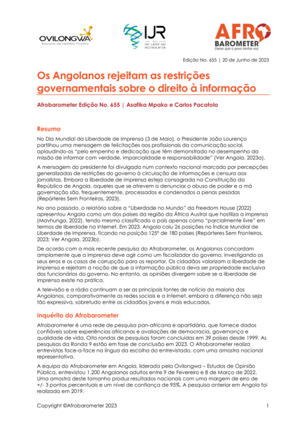 "De acordo com a mais recente pesquisa do Afrobarometer, os Angolanos concordam amplamente que a imprensa deve agir como um fiscalizador do governo, investigando os seus erros e os casos de corrupção para os reportar. Os cidadãos valorizam a liberdade de imprensa e rejeitam a noção de que a informação pública deva ser propriedade exclusiva dos funcionários do governo. No entanto, as opiniões divergem sobre se a liberdade de imprensa existe na prática. A televisão e a rádio continuam a ser as principais fontes de notícia da maioria dos Angolanos, comparativamente as redes sociais e a Internet, embora a diferença não seja tão expressiva, sobretudo entre os cidadãos jovens e mais educados." (Resumo)