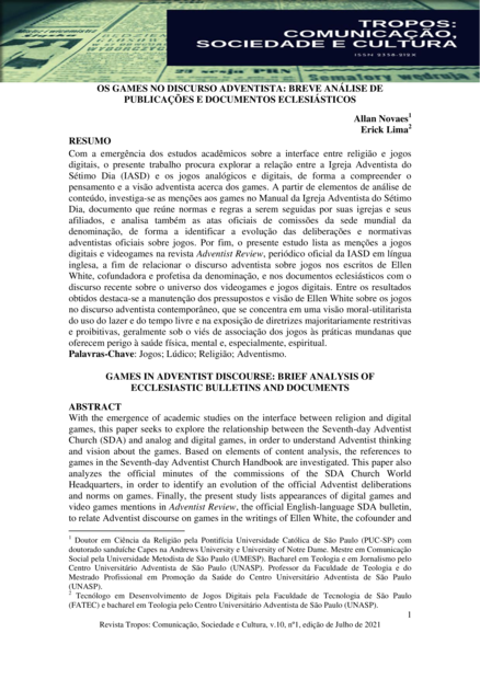 "Com a emergência dos estudos acadêmicos sobre a interface entre religião e jogos digitais, o presente trabalho procura explorar a relação entre a Igreja Adventista do Sétimo Dia (IASD) e os jogos analógicos e digitais, de forma a compreender o pensamento e a visão adventista acerca dos games. A partir de elementos de análise de conteúdo, investiga-se as menções aos games no Manual da Igreja Adventista do Sétimo Dia, documento que reúne normas e regras a serem seguidas por suas igrejas e seus afiliados, e analisa também as atas oficiais de comissões da sede mundial da denominação, de forma a identificar a evolução das deliberações e normativas adventistas oficiais sobre jogos. Por fim, o presente estudo lista as menções a jogos digitais e videogames na revista Adventist Review, periódico oficial da IASD em língua inglesa, a fim de relacionar o discurso adventista sobre jogos nos escritos de Ellen White, cofundadora e profetisa da denominação, e nos documentos eclesiásticos com o discurso recente sobre o universo dos videogames e jogos digitais. Entre os resultados obtidos destaca-se a manutenção dos pressupostos e visão de Ellen White sobre os jogos no discurso adventista contemporâneo, que se concentra em uma visão moral-utilitarista do uso do lazer e do tempo livre e na exposição de diretrizes majoritariamente restritivas e proibitivas, geralmente sob o viés de associação dos jogos às práticas mundanas que oferecem perigo à saúde física, mental e, especialmente, espiritual." (Abstract)