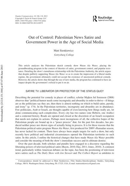"This article analyzes the Palestinian sketch comedy show Watan Ala Watar, placing the groundbreaking program in the context of theories of satire, government control, and popular resistance. Detailing the show’s tumultuous relationship with the Palestinian Authority, the article argues that despite publicly supporting Watan Ala Watar so as to create the impression of a liberal media regime, the government ultimately could not accept the existence of uncensored political comedy. However, the article shows that through the use of new media, the program has continued to have an impact despite the government’s refusal to put it on air." (Abstract)