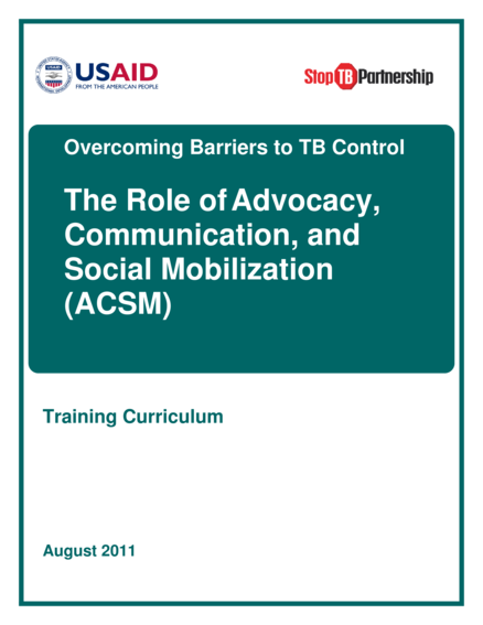 "Advocacy, communication, and social mobilization (ACSM) refers to a set of interventions that supports tuberculosis (TB) control goals and objectives at international, national, and local levels. These include advocating for sufficient resources, promoting healthy behaviors and attitudes, and engaging affected communities in the fight against TB. ACSM activities also can battle stigma, correct misconceptions about TB, and identify new funding mechanisms to support TB control—all of which are essential to sustaining and increasing the gains that we have made in TB control over the past several decades. This curriculum is designed for training TB control professionals and civil society activists at national and local levels who are involved in ACSM efforts. It is designed to provide countrylevel staff with the specific knowledge and skills to plan, implement, and evaluate effective ACSM interventions linked to specific TB control objectives. The curriculum structure and methodologies proposed by PATH were approved by the Stop TB Partnership ACSM Country Level Core Group members for global use. The original version of the curriculum was significantly refined and modified in response to partners’ comments and to meet participants’ needs." (Introduction, page 2)