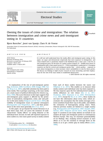 "It is still not well understood how the media affect anti-immigrant party voting. In this paper, we argue and demonstrate empirically that mere exposure to immigration- and crime-related news is positively related to the likelihood that a voter casts a vote for an anti-immigrant party. On the basis of a media content analysis (N = 20,084 news items) in combination with a voter panel survey (N = 17,014 respondents) conducted in 11 European countries we find for several anti-immigrant parties that e ceteris paribus e exposure to news about immigration or crime increases voters' probabilities to vote for these parties. We discuss our findings in light of prior research on issue ownership, and their implications for the role of the mass media in established democracies"(Abstract)