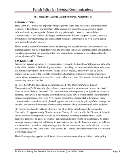"1. The purpose of church communications is to relay information about the parish to a broad or specific audience.