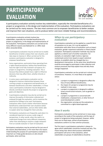"A participatory evaluation actively involves key stakeholders, especially the intended beneficiaries of a project or programme, in the design and implementation of the evaluation. Participatory evaluations can be carried out for many reasons. The two most common are to empower beneficiaries to better analyse and improve their own situations, and to produce better and more reliable findings and recommendations." (Introduction)
