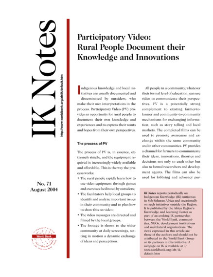 "Indigenous knowledge and local initiatives are usually documented and disseminated by outsiders, who make their own interpretations in the process. Participatory Video (PV) provides an opportunity for rural people to document their own knowledge and experiences and to express their wants and hopes from their own perspectives. The process of PV The process of PV is, in essence, extremely simple, and the equipment required is increasingly widely available and affordable. This is the way the process works: The rural people rapidly learn how to use video equipment through games and exercises facilitated by outsiders; The facilitators help local groups to identify and analyze important issues in their community and to plan how to show this on video; The video messages are directed and filmed by the local groups; The footage is shown to the wider community at daily screenings, setting in motion a dynamic exchange of ideas and perceptions." (Page 1)