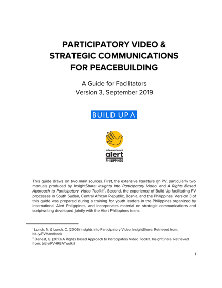 "This guide draws on two main sources. First, the extensive literature on PV, particularly two manuals produced by InsightShare: Insights Into Participatory Video and A Rights Based Approach to Participatory Video Toolkit. Second, the experience of Build Up facilitating PV processes in South Sudan, Central African Republic, Bosnia, and the Philippines. Version 3 of this guide was prepared during a training for youth leaders in the Philippines organized by International Alert Philippines, and incorporates material on strategic communications and scriptwriting developed jointly with the Alert Philippines team." (Page 1)