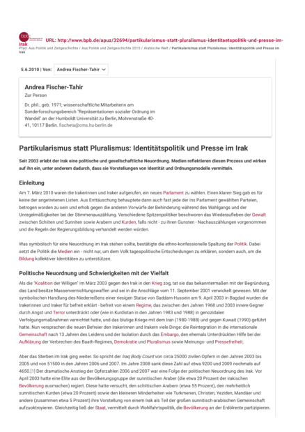 "Am 7. März 2010 waren die Irakerinnen und Iraker aufgerufen, ein neues Parlament zu wählen. Einen klaren Sieg gab es für keine der angetretenen Listen. Aus Enttäuschung behauptete dann auch fast jede der ins Parlament gewählten Parteien, betrogen worden zu sein und erhob gegen die anderen Vorwürfe der Behinderung während des Wahlgangs und der Unregelmäßigkeiten bei der Stimmenauszählung. Verschiedene Spitzenpolitiker beschworen das Wiederaufleben der Gewalt zwischen Schiiten und Sunniten sowie Arabern und Kurden, falls nicht - zu ihren Gunsten - Nachauszählungen vorgenommen und die Regeln der Regierungsbildung verhandelt werden würden. Was symbolisch für eine Neuordnung im Irak stehen sollte, bestätigte die ethno-konfessionelle Spaltung der Politik. Dabei setzt die Politik die Medien ein - nicht nur, um dem Volk tagespolitische Entscheidungen zu erklären, sondern auch, um die Bildung kollektiver Identitäten zu unterstützen." (Einleitung)