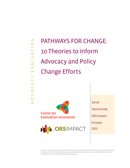"This brief lays out 10 theories grounded in diverse disciplines and worldviews that have relevance to the world of advocacy and policy change. These theories can help to untangle beliefs and assumptions about the inner workings of the policy making process and identify causal connections supported by research to explain how and why a change may or may not occur. This piece is not meant to be comprehensive of all possible relevant theories and approaches; rather, it introduces and illustrates a handful of theories that may be useful to advocates, funders, and evaluators. While the theories included may have broad applicability, the brief is grounded in the context of US domestic policy. Knowing about existing theories may sharpen your own thinking, provide new ways of looking at the policy world, and give you a leg up on developing your own theory of change. The final section gives concrete examples of the way in which advocates, funders, and evaluators can use this brief in their work." (Introduction, page 1-2)
