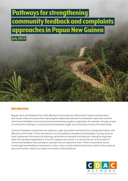 "Acknowledging the contextual challenges in Papua New Guinea, CDAC recommends the following actions to UNDP and other response organisations to strengthen approaches to two-way communication with communities in disaster response activities. 1. Utilise the newly established Community of Practice for communication, community engagement and accountability as a space for creating a learning agenda on two-way communication with communities; mapping active complaints and feedback systems and related activities of responders, and coordinating on key messaging to communities on priority issues. 2. Explore the possibility of establishing a collective complaints and feedback mechanism in Papua New Guinea, based on one or more of the models outlined in this brief. 3. In parallel, instigate a dialogue with relevant government bodies on investment and approaches to complaints and feedback, and the viability of a government-led or co-led mechanism. 4. Share good practices and document how response actors are acknowledging and responding to cultural reluctance to provide feedback, especially negative feedback, in engagement activities. 5. Build partnerships and collaboration with groups trusted by communities, such as religious organisations, to strengthen two-way communication efforts." (Recommendations, page 4)