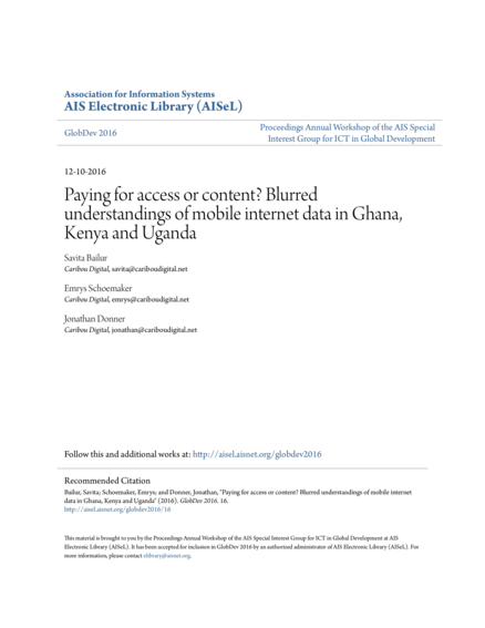 "The paper addresses the blurred understandings of what developing country mobile internet users feel they are paying for. The move towards increasing online news and music consumption around the world has resulted in low growth in paid content consumption and a digital advertising market that is not highly favourable for news or entertainment providers. From a major study conducted on mobile phone based internet behaviours in Ghana, Kenya and Uganda in 2015, we find consumption in these countries reflects the trends observed in more mature markets where the decline in news purchase revenues and advertising rates raises fundamental questions about the business models of independent media. While users enjoy the personalized content benefits of the mobile web, they feel that paying for data (i.e. Mobile connection and data bytes) is sufficient and conflate it with paying for content (i.e. Content in an online newspaper or online music). We argue that deconstructing misunderstandings of paying for mobile internet access and paying for content (including ascertaining whether they are genuine misunderstandings) is important for understanding how to achieve a free and fair internet, where content is accessible but generates enough profit to be sustainable." (Abstract)