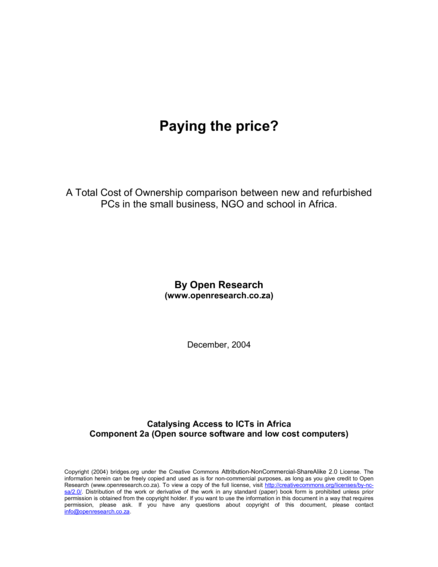 "Given the budget, good quality new PCs are likely to be the most stable, and in many instances will be the preferred technology choice. However, their high purchase price remains a key inhibitor to lowering their comparative total cost of ownership (TCO) in a small business, NGO or school. New PC purchase prices can account for 63-85% of the ownership costs that make TCO different between new and refurbished PCs. In contrast, a key TCO inhibitor for refurbished PCs is their failure rate and associated ongoing costs, accounting for 64-75% of the comparative TCO costs. A network of good quality refurbished PCs (imported brands such as Hewlett Packard, Dell and IBM) offers a window period of stability, making them a viable technology choice under certain conditions. They are likely to have the lowest TCO over five years. While the hardware replacement costs over that period could be the equivalent of the purchase price of the PCs, most of these costs are likely to occur in the final years of ownership. The high frequency of failures, together with the high ongoing costs for lower quality refurbished PCs (some 75% of the comparative totals), suggests that they should not be considered a viable technology option. In the case of lower quality refurbished PCs, hardware replacement costs alone can be more than 140% the purchase price of the PCs. A high level of failure can be expected throughout the five years of ownership." (Executive summary, p.4)