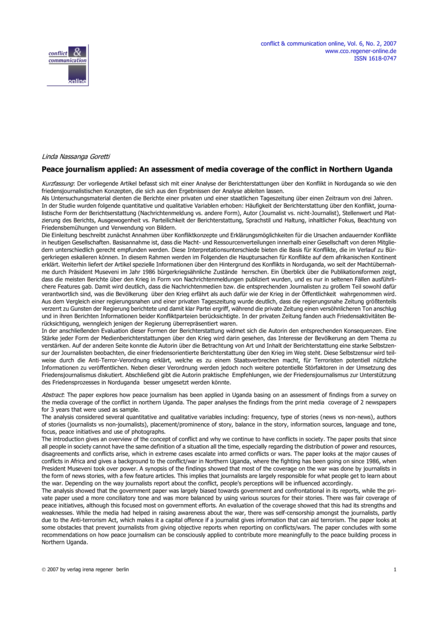 "The paper explores how peace journalism has been applied in Uganda basing on an assessment of findings from a survey on the media coverage of the conflict in northern Uganda. The paper analyses the findings from the print media coverage of 2 newspapers for 3 years that were used as sample. The analysis considered several quantitative and qualitative variables including: frequency, type of stories (news vs non-news), authors of stories (journalists vs non-journalists), placement/prominence of story, balance in the story, information sources, language and tone, focus, peace initiatives and use of photographs. The introduction gives an overview of the concept of conflict and why we continue to have conflicts in society. The paper posits that since all people in society cannot have the same definition of a situation all the time, especially regarding the distribution of power and resources, disagreements and conflicts arise, which in extreme cases escalate into armed conflicts or wars. The paper looks at the major causes of conflicts in Africa and gives a background to the conflict/war in Northern Uganda, where the fighting has been going on since 1986, when President Museveni took over power. A synopsis of the findings showed that most of the coverage on the war was done by journalists in the form of news stories, with a few feature articles. This implies that journalists are largely responsible for what people get to learn about the war. Depending on the way journalists report about the conflict, people's perceptions will be influenced accordingly. The analysis showed that the government paper was largely biased towards government and confrontational in its reports, while the private paper used a more conciliatory tone and was more balanced by using various sources for their stories. There was fair coverage of peace initiatives, although this focused most on government efforts. An evaluation of the coverage showed that this had its strengths and weaknesses. While the media had helped in raising awareness about the war, there was self-censorship amongst the journalists, partly due to the Anti-terrorism Act, which makes it a capital offence if a journalist gives information that can aid terrorism. The paper looks at some obstacles that prevent journalists from giving objective reports when reporting on conflicts/wars. The paper concludes with some recommendations on how peace journalism can be consciously applied to contribute more meaningfully to the peace building process in Northern Uganda." (Abstract)