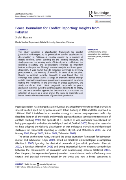 "This study proposes a classification framework for conflict journalism with respect to its potential for conflict escalation and de-escalation in Pakistan—a country marred by a number of deadly conflicts. While building on the existing literature, the study proposes the varying levels of intensity of a conflict and the resulting escalatory and de-escalatory coverage as important factors in the process. Through content analysis and focus group discussion, it was found that de-escalatory coverage is inversely proportional to the intensity of a conflict in terms of its perceived threats to national security. Secondly it was found that the coverage was spread across a range of thematic frames though certain perspectives got more prominence as compared to others. Noting the variations in the presence of peace journalism, the study concludes that critical pragmatic approach to peace journalism is better suited to address queries relating to its theory and practice than other approaches because it accommodates the retention of peace as a value and at the same is pragmatic and hence honors the requirements of journalistic profession." (Abstract)
