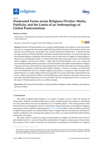 "Scholars of Pentecostalism have usually studied people who embrace it, but rarely those who do not. I suggest that the study of global Pentecostalism should not limit itself to Pentecostal churches and movements and people who consider themselves Pentecostal. It should include the repercussions of Pentecostal ideas and forms outside Pentecostalism: on non-Pentecostal and non-Christian religions, on popular cultural forms, and on what counts as ‘religion’ or ‘being religious’. Based on my ethnographic study of a charismatic-Pentecostal mega-church and a neo-traditional African religious movement in Ghana, I argue that neo-Pentecostalism, due to its strong and mass-mediated public presence, provides a powerful model for the public representation of religion in general, and some of its forms are being adopted by non-Pentecostal and non-Christian groups, including the militantly anti-Pentecostal Afrikania Mission. Instead of treating neo-Pentecostal and neo-traditionalist revival as distinct religious phenomena, I propose to take seriously their intertwinement in a single religious field and argue that one cannot sufficiently understand the rise of new religious movements without understanding how they influence each other, borrow from each other, and define themselves vis-à-vis each other. This has consequences for how we conceive of the study of Pentecostalism and how we define its object." (Abstract)