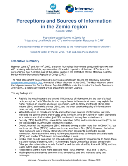 "Between June 30th and July 10th, 2012, a team of four trained interviewers conducted interviews with 400 randomly selected adults, representative of the adult population of the town of Zemio and its surroundings, over 1,000 km east of the capital Bangui in the prefecture of Haut Mbomou, near the border with the Democratic Republic of Congo (DRC). The rapid assessment was conducted to serve as a comparison case to the previously published assessment conducted in Obo, the capital of Haut Mbomou, in July 2012. The Haut-Mbomou, one of the 14 prefectures of the Central African Republic (CAR) is under the threat of the Lord’s Resistance Army (LRA), a notoriously violent armed group from northern Uganda. These results suggest that information must first be local. Respondents in Zemio lacked a local source of news that would contribute to a better perceived access and quality of information. However, having a local quality information source may not necessarily have an impact on understanding and reported perception of humanitarian action." (Internews website)