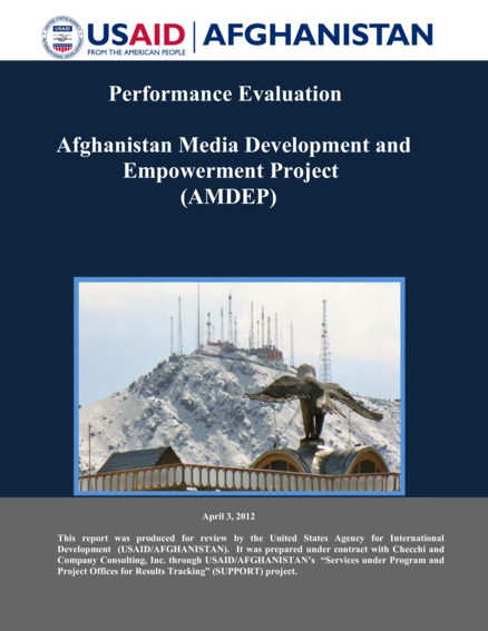 "The purpose of this evaluation is to identify results and lessons learned from USAID’s Afghanistan Media Development and Empowerment Project (AMDEP). AMDEP was designed as a one-year project (later extended) that began on November 1, 2010. It built on eight years of previous USAID media activities in Afghanistan and continued USAID’s strategic focus on improving news and development-related radio information for under-served groups such as rural families, women and young people. Through the consistent funding and support to the radio industry in Afghanistan, USAID has underwritten an enhanced forum for news and information programming outside of Kabul. By choosing radio as its primary tool, the initial groundwork was laid for a national messaging forum. Enabling provincial and district broadcasters to receive a consistent and increasingly professional series of programs was a good approach. That many of the programs have to do with national, regional and international news and information is creating the conditions for more and better citizen participation in democratic development. The stage has been set for national advertising supported messaging in the future. AMDEP supports a comprehensive “value chain” approach to strengthening the media sector, dealing with training of journalists; establishing and operating a network of rural radio stations; introducing “new media” to enable amateur voices to communicate about social, economic, and development issues; encouraging advocacy to protect journalistic freedoms; helping citizens understand and value the importance of media information and news; training media lawyers; and supporting new media laws and policies that will support development of a dynamic, independent media industry. Internews is the lead implementer of AMDEP activities and of previous USAID media activities that led to AMDEP. Overall, AMDEP has been remarkably successful. It had to function in a context of administrative delays and funding uncertainties, security threats, an environment of many different media projects and an unpredictable economy. The technical and managerial depth of the Internews team was an important factor in the project’s success, as was its selection of effective Afghan partner organizations. Flexibility and agility on the part of USAID and Internews made it possible to adapt to changing circumstances." (Executive summary, page 1)