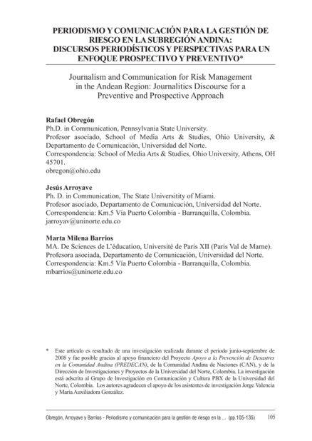"El presente artÃculo analiza los discursos periodÃsticos y la representación de temas claves vinculados a la gestión del riesgo de desastres en cuatro paÃses de la subregión Andina. El estudio se apoya en elementos teóricos de la investigación en medios y periodismo, tales como Agenda Setting (establecimiento de la agenda periodÃstica) y Encuadre, y de conceptos claves sobre gestión del riesgo de desastres. El estudio analiza 1) la manera como un conjunto de medios escritos de la subregión andina, a través de sus ediciones online, abordaron y caracterizaron la gestión de riesgo durante el perÃodo abril, 2007 - julio, 2008; 2) la naturaleza de los discursos periodÃsticos predominantes durante ese perÃodo; y 3) las implicaciones que tales discursos pueden tener en la comunicación para la gestión de riesgo de desastres. El estudio ofrece evidencia empÃrica que puede servir de base para orientar acciones futuras que ayuden a periodistas y comunicadores a informar mejor a la comunidad." (Resumen)