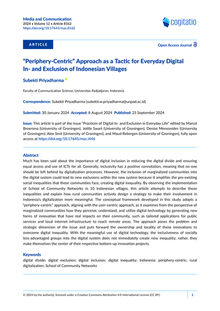 "Much has been said about the importance of digital inclusion in reducing the digital divide and ensuring equal access and use of ICTs for all. Generally, inclusivity has a positive connotation, meaning that no one should be left behind by digitalization processes. However, the inclusion of marginalized communities into the digital system could lead to new exclusions within the new system because it amplifies the pre?existing social inequalities that these communities face, creating digital inequality. By observing the implementation of School of Community Networks in 10 Indonesian villages, this article attempts to describe those inequalities and explain how rural communities actively design a strategy to make their involvement in Indonesia's digitalization more meaningful. The conceptual framework developed in this study adopts a "periphery?centric" approach, aligning with the user?centric approach, as it examines from the perspective of marginalized communities how they perceive, understand, and utilize digital technology by generating new forms of innovation that have real impacts on their community, such as tailored applications for public services and local internet infrastructure to reach remote areas. The approach poses the problem and strategic dimension of the issue and puts forward the ownership and locality of these innovations to overcome digital inequality. With the meaningful use of digital technology, the inclusiveness of socially less?advantaged groups into the digital system does not immediately create new inequality; rather, they make themselves the center of their respective bottom?up innovation projects." (Abstract)