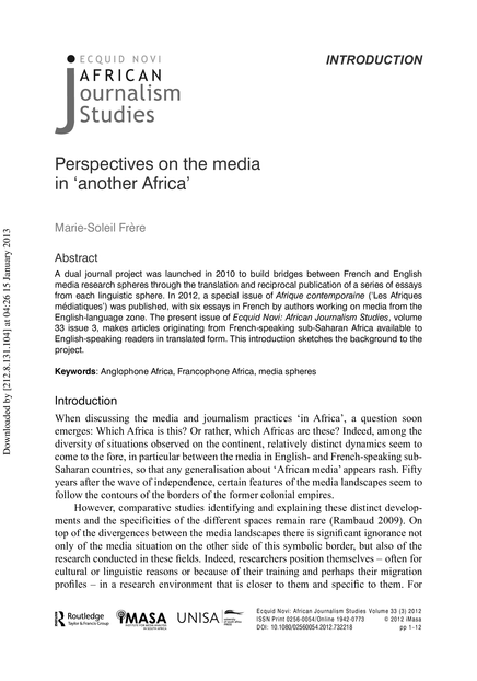 "A dual journal project was launched in 2010 to build bridges between French and English media research spheres through the translation and reciprocal publication of a series of essays from each linguistic sphere. In 2012, a special issue of Afrique contemporaine (‘Les Afriques médiatiques’) was published, with six essays in French by authors working on media from the English-language zone. The present issue of Ecquid Novi: African Journalism Studies, volume 33 issue 3, makes articles originating from French-speaking sub-Saharan Africa available to English-speaking readers in translated form. This introduction sketches the background to the project." (Abstract)