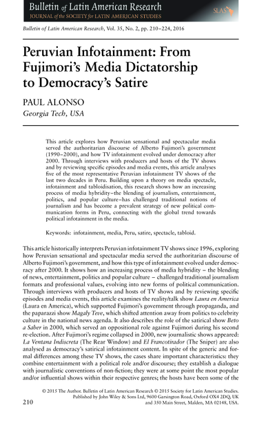 "This article explores how Peruvian sensational and spectacular media served the authoritarian discourse of Alberto Fujimori's government (1990-2000), and how TV infotainment evolved under democracy after 2000. Through interviews with producers and hosts of the TV shows and by reviewing specific episodes and media events, this article analyses five of the most representative Peruvian infotainment TV shows of the last two decades in Peru. Building upon a theory on media spectacle, infotainment and tabloidisation, this research shows how an increasing process of media hybridity-the blending of journalism, entertainment, politicsand popular culture-has challenged traditional notions of journalism and has become a prevalent strategy of new political communication forms in Peru, connecting with the global trend towards political infotainment in the media." (Abstract)