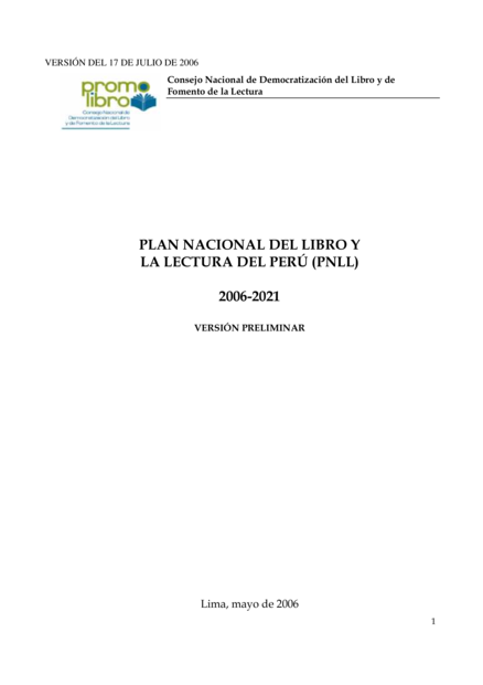 Plan nacional del libro y la lectura del Perú 2006-2021: Versión preliminar