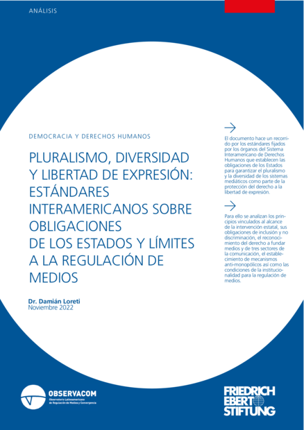 "Este documento hace un recorrido por los estándares fijados por los órganos del Sistema Interamericano de Derechos Humanos que establecen las obligaciones de los Estados para garantizar el pluralismo y la diversidad de los sistemas mediáticos como parte de la protección del derecho a la libertad de expresión. Para ello se analizan los principios vinculados al alcance de la intervención estatal, sus obligaciones de inclusión y no discriminación, el reconocimiento del derecho a fundar medios y de tres sectores de la comunicación, el establecimiento de mecanismos anti-monopólicos así como las condiciones de la institucionalidad para la regulación de medios." (Página 1)