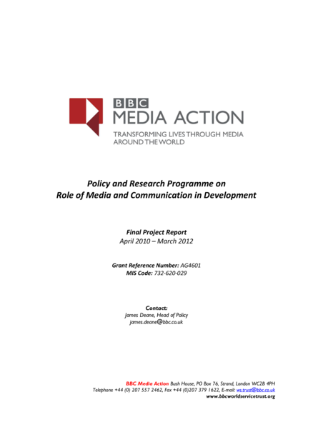 "This is the final report of the Policy and Research Programme on the Role of Media and Communication Development. It provides a narrative overview of progress and impact between April 2010 and March 2012 of the DFID funded Policy and Research Programme on the Role of Media in Development, building on an earlier report submitted for activities carried out between April 2010 and March 2011. In 2006 the Department for International Development (DFID) allocated £2.5 million over five years for the establishment of a 'Policy and Research Programme on the Role of Media and Communication in Development' to be managed by BBC Media Action (formerly the BBC World Service Trust). The Programme ran from July 2006 through to March 2012, including a no-cost extension. A small additional contribution to the Programme from the Swedish International Development Agency was received over the period (approximately £300,000 over the period 2009-2012). In November 2011, DFID reached agreement with the BBC World Service Trust (since January 2012, renamed as BBC Media Action) for a new Global Grant amounting to £90 million over five years. The Policy and Research Programme ends formally on March 31st 2012 and all funding allocated under the programming will be spent by that date.