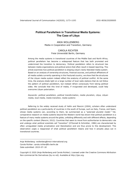 "Among the media systems in transitional countries of the Middle East and North Africa, political parallelism has become a widespread feature that has both promoted and undermined the transition to democracy. Political parallelism refers to structural ties between media organizations and political actors that often result in biased reporting. This article examines how political parallelism is shaping Libya’s newly liberated media system. Based on an analysis of ownership structures, financial sources, and political affiliations of all media outlets currently operating in this fractured country, we show that the structures of the Libyan media system indeed reflect the anatomy of political conflict. At the same time, the analysis sheds light on a large number of local radio stations that do not follow the pattern of political parallelism, but instead refrain consciously from taking political sides. We conclude that this kind of media, if invigorated and developed, could help overcome Libyan polarization." (Abstract)