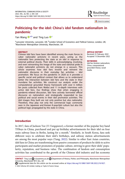 "Chinese idol fans have been identified among the main forces in cyber nationalist activisms in recent years, acting as the nationalist fans protecting the state as an idol in response to external political shocks. Their skills in acknowledging, involving, and even reinventing the image of the state and national pride in cyber nationalist activisms do not emerge in a vacuum. This article examines how idol fans involve and reinvent the nationalist discourse in their everyday fan activities – idol promotion. We focus on the pandemic in 2020 as it provides a specific social and political context that allows us to understand better the interaction between idol fans and the state in their mundane fan activities. We construct our analysis under the computational grounded theory framework with over 6 million fan posts collected from Weibo and 11 in-depth interviews with active idol fans. Our findings show that when engaging in pandemic-related discussion, idol fans actively borrowed official discourse on nationalism and strategically responded to key political and social events in their idol promotion activities. The idol images they built are not only positive but also nationalist. Therefore, they play not only the commercial logic commonly seen in the Japanese and Korean K-pop/idol culture but also the political logic propagated by the state in China." (Abstract)