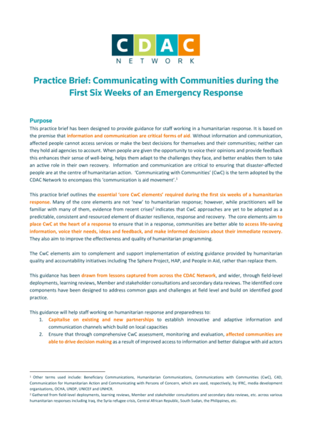 "This practice brief outlines the essential ‘Communicating with Communities’ (CwC) elements’ required during the first six weeks of a humanitarian response. Many of the core elements are not ‘new’ to humanitarian response; however, while practitioners will be familiar with many of them, evidence from recent crises indicates that CwC approaches are yet to be adopted as a predictable, consistent and resourced element of disaster resilience, response and recovery. The core elements aim to place CwC at the heart of a response to ensure that in a response, communities are better able to access life-saving information, voice their needs, ideas and feedback, and make informed decisions about their immediate recovery." (Page 1)