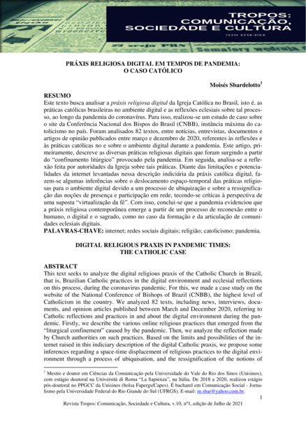 "Este texto busca analisar a práxis religiosa digital da Igreja Católica no Brasil, isto é, as práticas católicas brasileiras no ambiente digital e as reflexões eclesiais sobre tal processo, ao longo da pandemia do coronavírus. Para isso, realizou-se um estudo de caso sobre o site da Conferência Nacional dos Bispos do Brasil (CNBB), instância máxima do catolicismo no país. Foram analisados 82 textos, entre notícias, entrevistas, documentos e artigos de opinião publicados entre março e dezembro de 2020, referentes às reflexões e às práticas católicas no e sobre o ambiente digital durante a pandemia. Este artigo, primeiramente, descreve as diversas práticas religiosas digitais que foram surgindo a partir do “confinamento litúrgico” provocado pela pandemia. Em seguida, analisa-se a reflexão feita por autoridades da Igreja sobre tais práticas. Diante das limitações e potencialidades da internet levantadas nessa descrição indiciária da práxis católica digital, fazem-se algumas inferências sobre o deslocamento espaço-temporal das práticas religiosas para o ambiente digital devido a um processo de ubiquização e sobre a ressignificação das noções de presença e participação em rede, tecendo-se críticas à perspectiva de uma suposta “virtualização da fé”. Com isso, conclui-se que a pandemia evidenciou que a práxis religiosa contemporânea emerge a partir de um processo de reconexão entre o humano, o digital e o sagrado, como no caso da formação e da articulação de comunidades eclesiais digitais." (Resumo)
