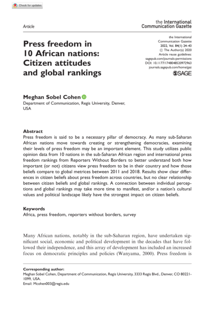 "Press freedom is said to be a necessary pillar of democracy. As many sub-Saharan African nations move towards creating or strengthening democracies, examining their levels of press freedom may be an important element. This study utilizes public opinion data from 10 nations in the sub-Saharan African region and international press freedom rankings from Reporters Without Borders to better understand both how important (or not) citizens view press freedom to be in their country and how those beliefs compare to global metrices between 2011 and 2018. Results show clear differences in citizen beliefs about press freedom across countries, but no clear relationship between citizen beliefs and global rankings. A connection between individual perceptions and global rankings may take more time to manifest, and/or a nation’s cultural values and political landscape likely have the strongest impact on citizen beliefs." (Abstract)