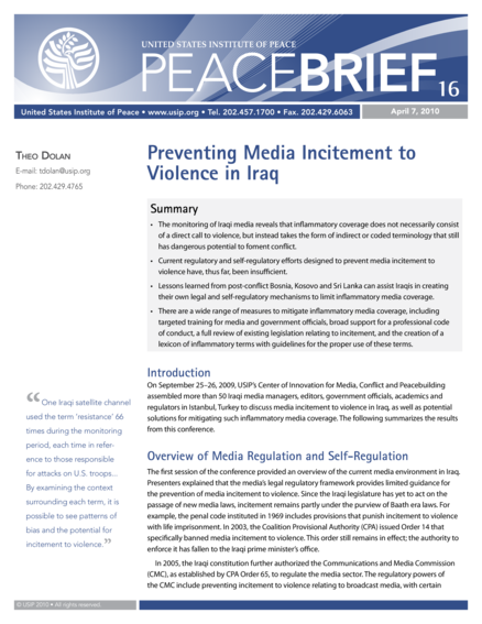 "The monitoring of Iraqi media reveals that inflammatory coverage does not necessarily consist of a direct call to violence, but instead takes the form of indirect or coded terminology that still has dangerous potential to foment conflict. Current regulatory and self-regulatory efforts designed to prevent media incitement to violence have, thus far, been insufficient. Lessons learned from post-conflict Bosnia, Kosovo and Sri Lanka can assist Iraqis in creating their own legal and self-regulatory mechanisms to limit inflammatory media coverage. There are a wide range of measures to mitigate inflammatory media coverage, including targeted training for media and government officials, broad support for a professional code of conduct, a full review of existing legislation relating to incitement, and the creation of a lexicon of inflammatory terms with guidelines for the proper use of these terms." (Abstract)