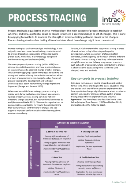 "Process tracing is a qualitative analysis methodology. The main purpose of process tracing is to establish whether, and how, a potential cause or causes influenced a specified change or set of changes. This is done by applying formal tests to examine the strength of evidence linking potential causes to the changes. Process tracing also involves testing alternative ideas about how change might have come about." (Introduction)