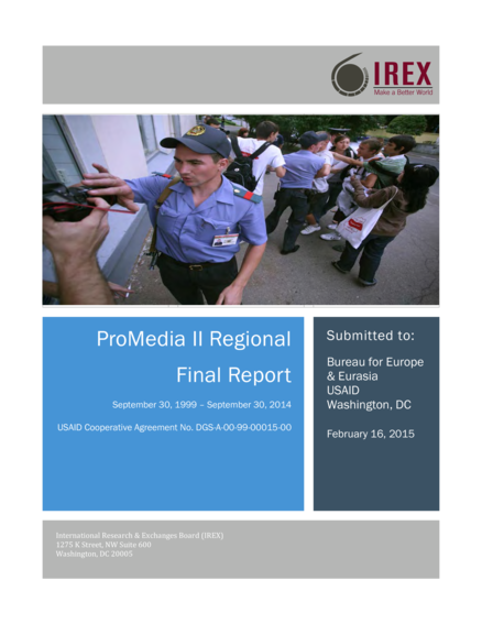 "USAID’s ProMedia II Regional project, implemented by IREX between 1999 and 2014 provided a flexible tool to support independent media in a time of transition in Europe and Eurasia (E&E). The project supported multi-year, full-time technical assistance projects in three countries: Bulgaria and Albania from 1999 to 2004 and Macedonia from 2000 to 2004. It gave USAID a platform to follow-up early assistance under another mechanism that gave rise to European Radio for Belarus, which has grown into an important off-shore alternative news source in a country with a largely state-controlled media. It gave IREX an opportunity to turn an idea for measuring a media sector as a whole into the Media Sustainability Index, a respected authority on the state of media in the E&E region. Finally, it served as a tool to fund a number of small-scale regional projects and to bring together disparate media development projects in E&E so that personnel could learn lessons from one another and make use of a strong network of talent working on similar issues." (Executive summary)