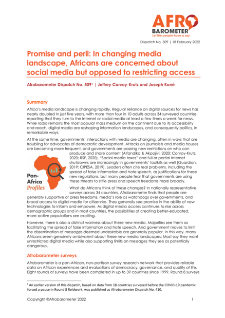 "Radio remains overwhelmingly the most common source for news in Africa. On average across 34 surveyed countries, two-thirds (68%) of respondents tune in at least a few times a week. Digital media use for news is growing quickly. Between 2014/2015 and 2019/2021, the share of Africans who get news from social media or the Internet at least a few times a week almost doubled, from 24% to 43% across 31 countries included in both survey rounds. Urban residents, better-educated citizens, men, and youth are most likely to use digital media in Africa. While use has increased among other groups as well, demographic gaps in digital media use have remained roughly the same since 2014/2015, and even increased with regard to urban/rural residence and education. Africans express broad support for the media's ro in fostering government accountability, and majorities support media freedoms in every country except Mozambique, Tunisia, Cameroon, Morocco, and Tanzania. But most Africans support their government's right to place limits on the dissemination of hate speech, false information, and messages that are insulting to their president. A majority (57%) of Africans see social media as having mostly positive effects on society, while just one-fourth (24%) see its impact as mostly negative. However, while Africans value social media's ability to inform and empower citizens, they also see distinct threats in its ability to spread false information and hate speech." (Key findings)