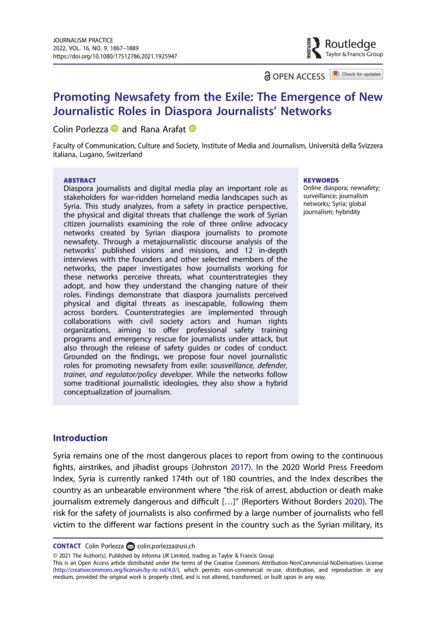 "Diaspora journalists and digital media play an important role as stakeholders for war-ridden homeland media landscapes such as Syria. This study analyzes, from a safety in practice perspective, the physical and digital threats that challenge the work of Syrian citizen journalists examining the role of three online advocacy networks created by Syrian diaspora journalists to promote newsafety. Through a meta-journalistic discourse analysis of the networks’ published visions and missions, and 12 in-depth interviews with the founders and other selected members of the networks, the paper investigates how journalists working for these networks perceive threats, what counterstrategies they adopt, and how they understand the changing nature of their roles. Findings demonstrate that diaspora journalists perceived physical and digital threats as inescapable, following them across borders. Counterstrategies are implemented through collaborations with civil society actors and human rights organizations, aiming to offer professional safety training programs and emergency rescue for journalists under attack, but also through the release of safety guides or codes of conduct. Grounded on the findings, we propose four novel journalistic roles for promoting newsafety from exile: sousveillance, defender, trainer, and regulator/policy developer. While the networks follow some traditional journalistic ideologies, they also show a hybrid conceptualization of journalism." (Abstract)