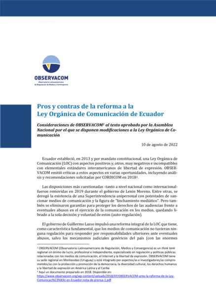 "Este documento contiene las consideraciones de OBSERVACOM al texto aprobado por la Asamblea Nacional por el que se disponen modificaciones a la Ley Orgánica de Comunicación." (commbox)