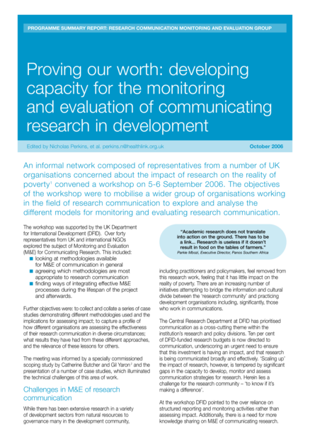 "An informal network composed of representatives from a number of UK organisations concerned about the impact of research on the reality of poverty convened a workshop on 5-6 September 2006. The objectives of the workshop were to mobilise a wider group of organisations working in the field of research communication to explore and analyse the different models for monitoring and evaluating research communication." (Page 1)