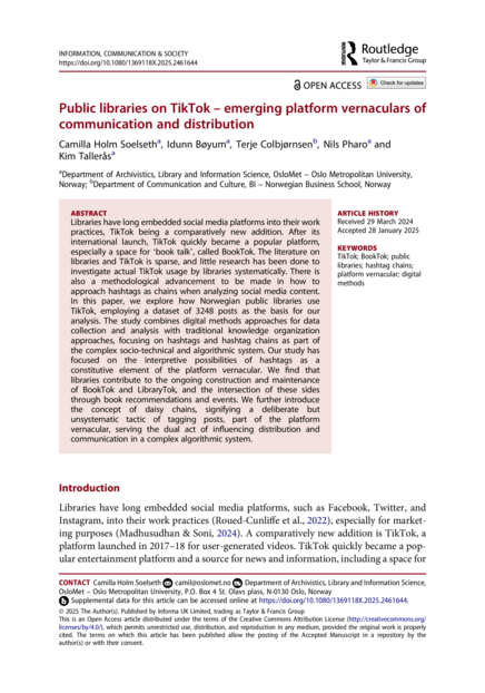 "Libraries have long embedded social media platforms into their work practices, TikTok being a comparatively new addition. After its international launch, TikTok quickly became a popular platform, especially a space for ‘book talk’, called BookTok. The literature on libraries and TikTok is sparse, and little research has been done to investigate actual TikTok usage by libraries systematically. There is also a methodological advancement to be made in how to approach hashtags as chains when analyzing social media content. In this paper, we explore how Norwegian public libraries use TikTok, employing a dataset of 3248 posts as the basis for our analysis. The study combines digital methods approaches for data collection and analysis with traditional knowledge organization approaches, focusing on hashtags and hashtag chains as part of the complex socio-technical and algorithmic system. Our study has focused on the interpretive possibilities of hashtags as a constitutive element of the platform vernacular. We find that libraries contribute to the ongoing construction and maintenance of BookTok and LibraryTok, and the intersection of these sides through book recommendations and events. We further introduce the concept of daisy chains, signifying a deliberate but unsystematic tactic of tagging posts, part of the platform vernacular, serving the dual act of influencing distribution and communication in a complex algorithmic system." (Abstract)