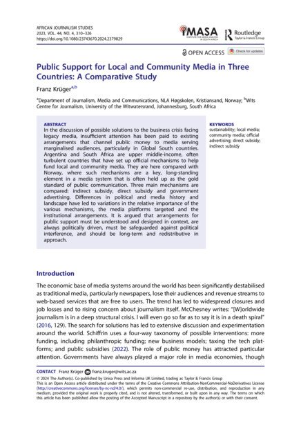 "In the discussion of possible solutions to the business crisis facing legacy media, insufficient attention has been paid to existing arrangements that channel public money to media serving marginalised audiences, particularly in Global South countries. Argentina and South Africa are upper middle-income, often turbulent countries that have set up official mechanisms to help fund local and community media. They are here compared with Norway, where such mechanisms are a key, long-standing element in a media system that is often held up as the gold standard of public communication. Three main mechanisms are compared: indirect subsidy, direct subsidy and government advertising. Differences in political and media history and landscape have led to variations in the relative importance of the various mechanisms, the media platforms targeted and the institutional arrangements. It is argued that arrangements for public support must be understood and designed in context, are always politically driven, must be safeguarded against political interference, and should be long-term and redistributive in approach." (Abstract)
