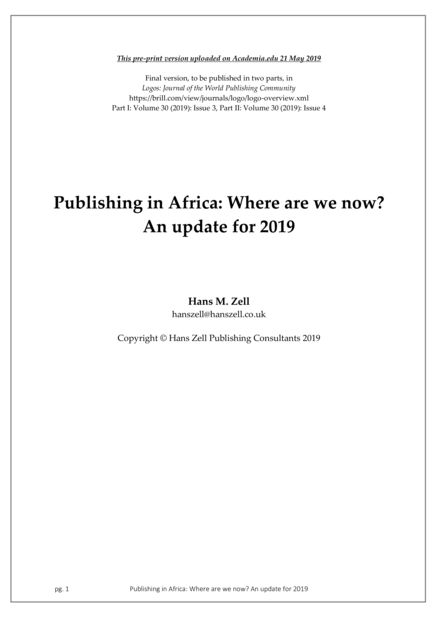 "This article is a sequel, and update, to a two-part article published in Logos. Journal of the World Publishing Community in 2008/09, which analysed the state of the book industries in sub-Saharan Africa thirty-five years after the major conference on ‘Publishing & Book Development in Africa’ that was held at the University of Ife (now Obafemi Awolowo University), Nigeria, in 1973 [...] Part One examines the persistent failure of African governments to support their book industries in a tangible and positive fashion, and their lack of support of public libraries. I review the current status of book development councils in Africa, and the unsatisfactory progress that has been made in establishing national book policies; examine the challenges of generating book industry data; and look at the opportunities now available to African publishers by the new digital environment. In Part Two I offer a number of reflections and recommendations on the way forward, particularly as it relates to capacity and skills building, training for book industry personnel, strengthening book professional associations, South-South linkages and knowledge sharing, encouraging international collaboration, the need for ongoing research and documentation, as well as issues as they relate to African books in the global market place, and the important but neglected area of publishing in African indigenous languages.