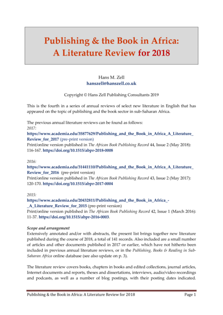 "This is the fourth in a series of annual reviews of select new literature in English that has appeared on the topic of publishing and the book sector in sub-Saharan Africa [...] Extensively annotated and/or with abstracts, the present list brings together new literature published during the course of 2018, a total of 141 records. Also included are a small number of articles and other documents published in 2017 or earlier, which have not hitherto been included in previous annual literature reviews, or in the Publishing, Books & Reading in SubSaharan Africa online database. The literature review covers books, chapters in books and edited collections, journal articles, Internet documents and reports, theses and dissertations, interviews, audio/video recordings and podcasts, as well as a number of blog postings, with their posting dates indicated." (Page 1)