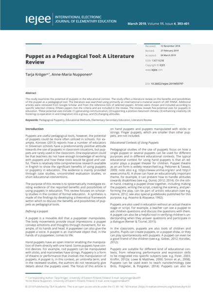 "This study examines the potential of puppets in the educational context. The study offers a literature review on the benefits and possibilities of the puppet as a pedagogical tool. The literature was searched using primarily an international e-material search of UEF FINNA. Additional articles were retrieved from Google Scholar and from the reference lists of selected papers. Articles were chosen and included according to specific selection criteria. Fifteen papers met the criteria and are included in the review. The review reveals five potential uses for puppets in education. These potential uses include: (1) generating communication, (2) supporting a positive classroom climate, (3) enhancing creativity, (4) fostering co-operation in and integration into a group, and (5) changing attitudes." (Abstract)