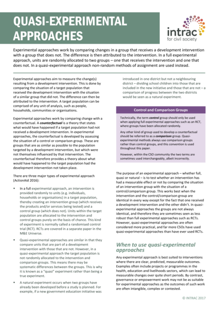 "Experimental approaches work by comparing changes in a group that receives a development intervention with a group that does not. The difference is then attributed to the intervention. In a full experimental approach, units are randomly allocated to two groups – one that receives the intervention and one that does not. In a quasi-experimental approach non-random methods of assignment are used instead." (Introduction)