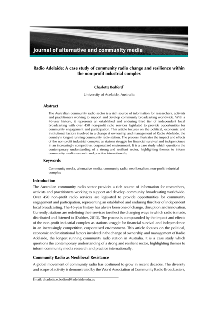 "The Australian community radio sector is a rich source of information for researchers, activists and practitioners working to support and develop community broadcasting worldwide. With a 46-year history, it represents an established and enduring third tier of independent local broadcasting with over 450 non-profit radio services legislated to provide opportunities for community engagement and participation. This article focuses on the political, economic and institutional factors involved in a change of ownership and management of Radio Adelaide, the country’s longest running community radio station. The process illustrates the impact and effects of the non-profit industrial complex as stations struggle for financial survival and independence in an increasingly competitive, corporatized environment. It is a case study which questions the contemporary understanding of a strong and resilient sector, highlighting themes to inform community media research and practice internationally." (Abstract)